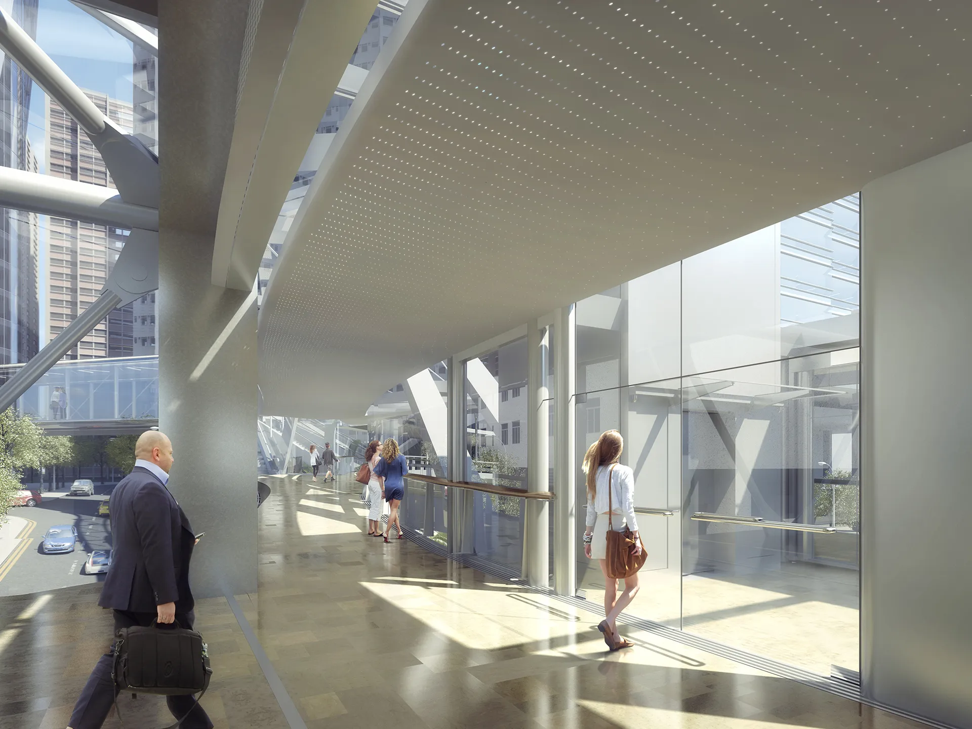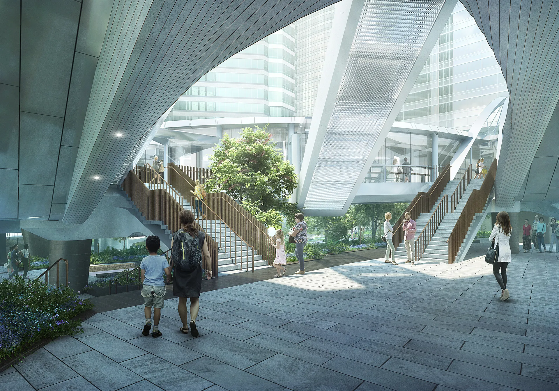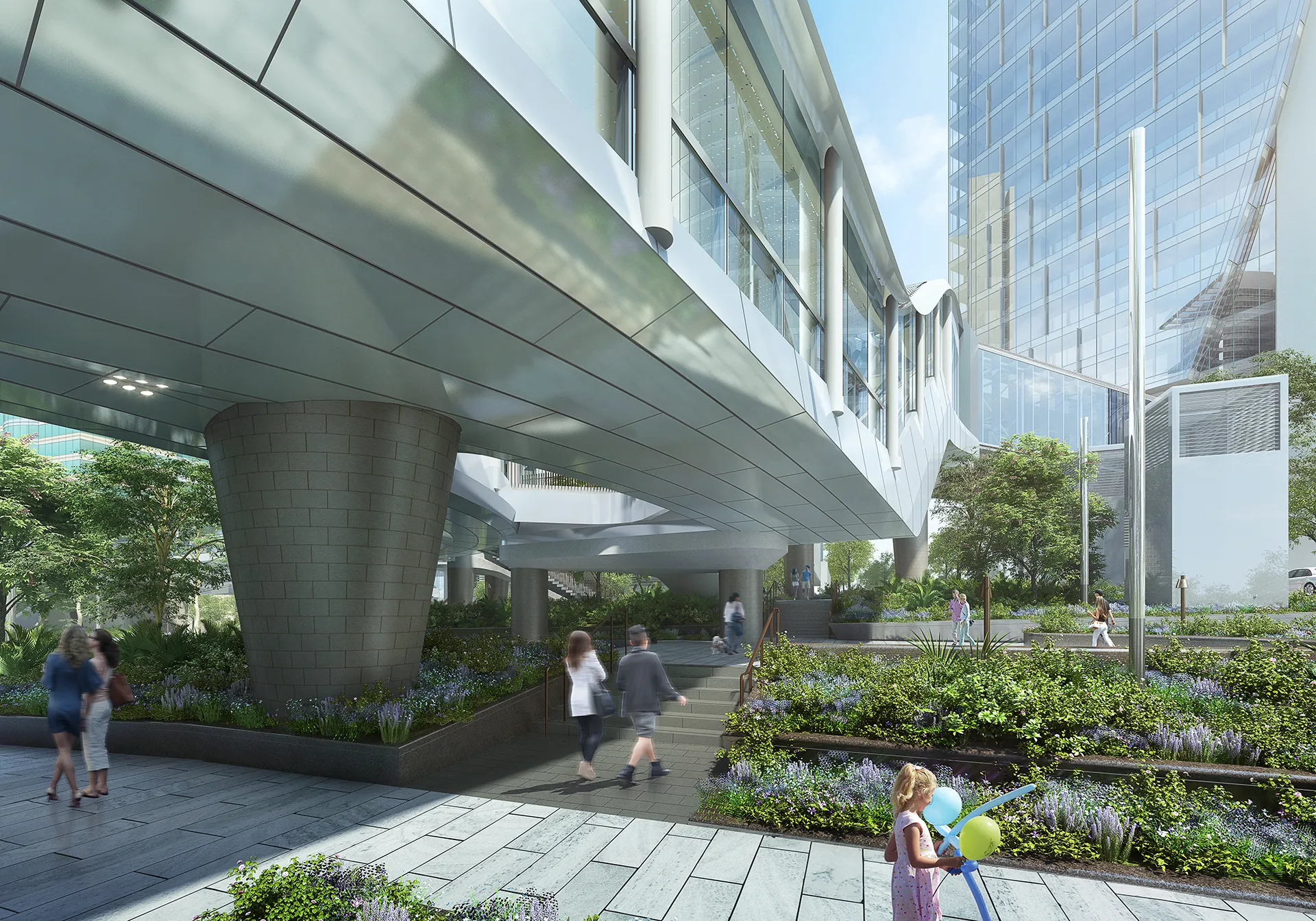 The walkways are situated in Taikoo Place, Hong Kong. Swire Properties' redevelopment of Taikoo Place is about bringing a new life to the Quarry Bay community, interconnecting the business environment with public activities and social context. The walkways are an important role in this grand mission connecting the new and existing buildings around Taikoo Place. They create a fluid but the discreet transition between the work environment and the garden with its peripheral amenities. The walkways will also play an important role in animating the garden and providing a promenade as well as direct passage to the green space. They are a symbolic expression of connecting and movement.